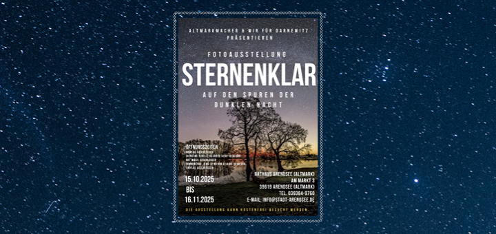 In Kooperation mit Kommunen, Vereinen und privaten Leistungsträgern lässt der AltmarkMacher e.V. seine Fotoausstellung „Sternenklar – auf den Spuren der dunklen Nacht“ nach und nach durch die Altmark wandern. Ziel ist es, die Ausstellung bis Ende 2026 in weiteren Teilen der Altmark zu zeigen. Interessierte Orte können sich gerne melden unter info@altmarkmacher.de
