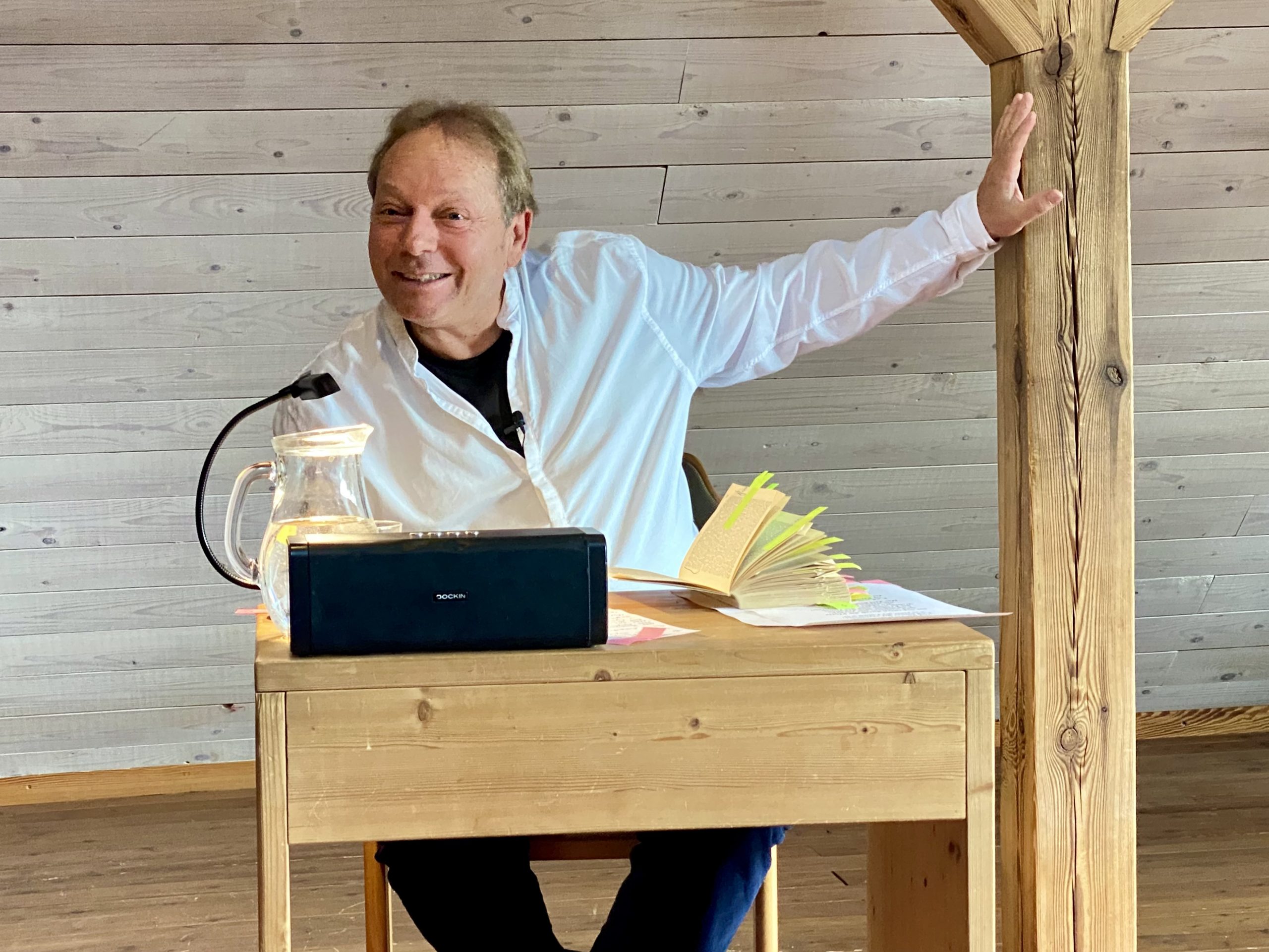 Lesung_Pablo_Miro von Redaktionsteam · Veröffentlicht 27. Mai 2025 · Aktualisiert 27. Mai 2025 Mann sitzt am Tisch, vor ihm ein Buch und eine Musikbox